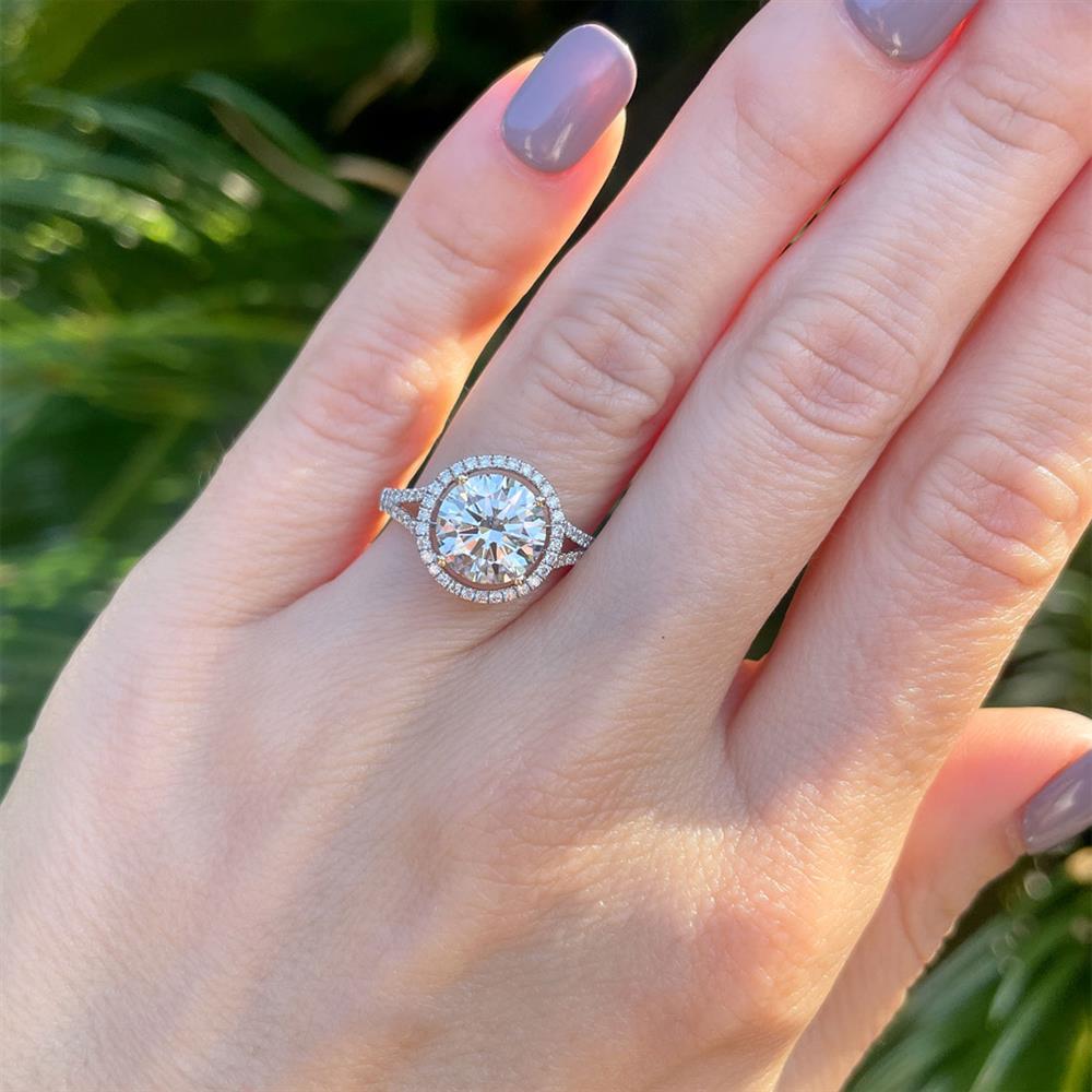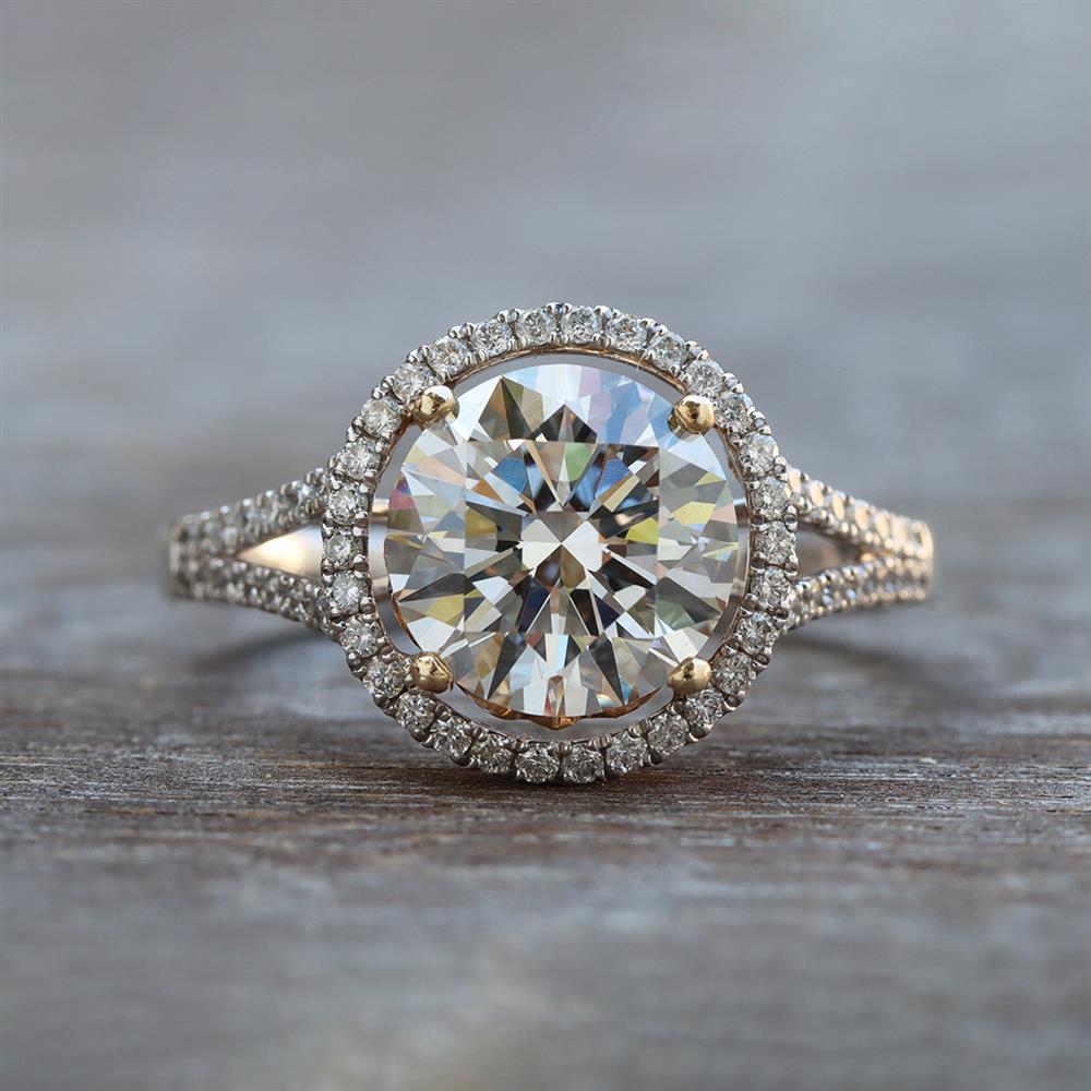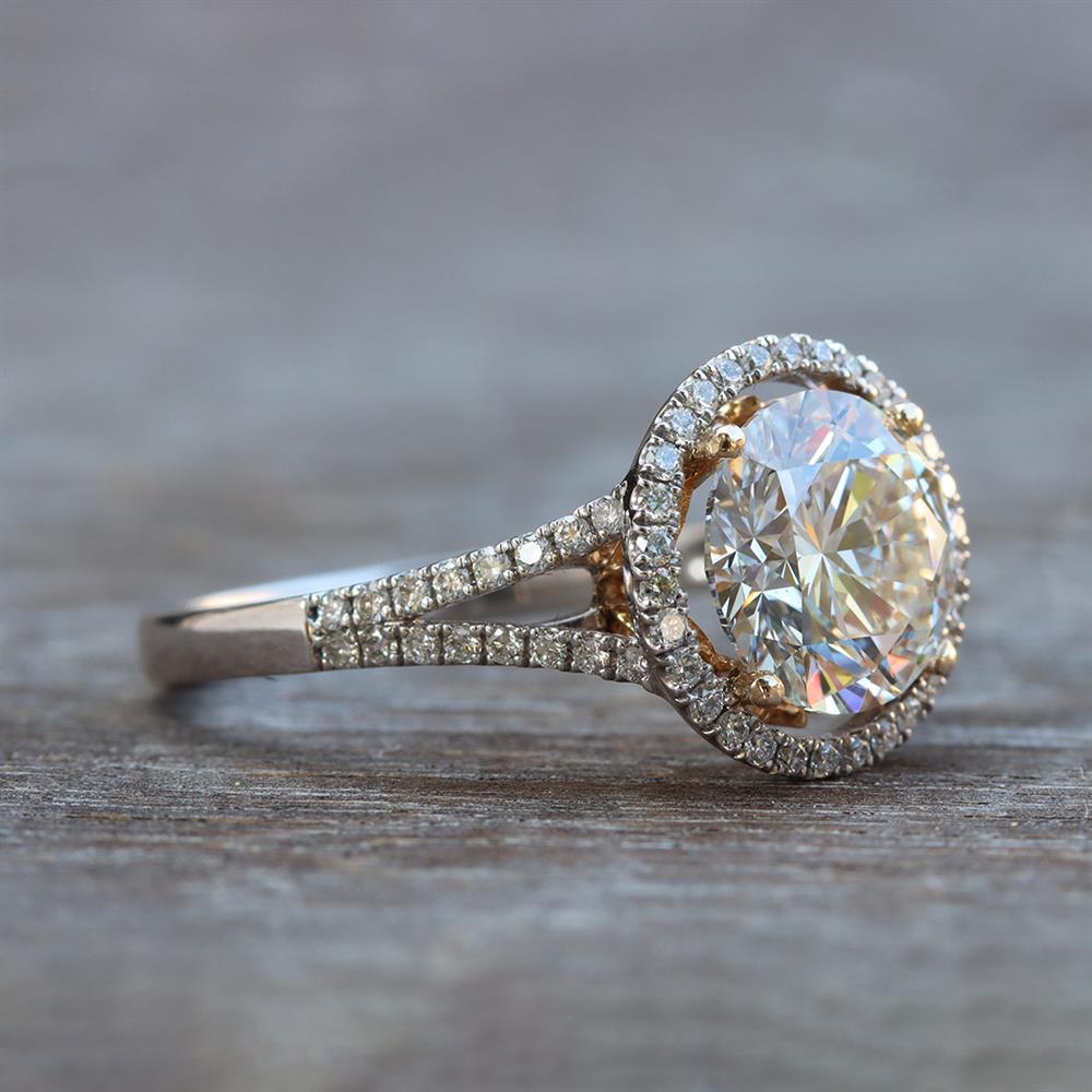 This gorgeous halo engagement ring features a 2.45ct round lab grown diamond with 0.31ctw natural diamond accents set in 14k white gold with 14k yellow gold accents.